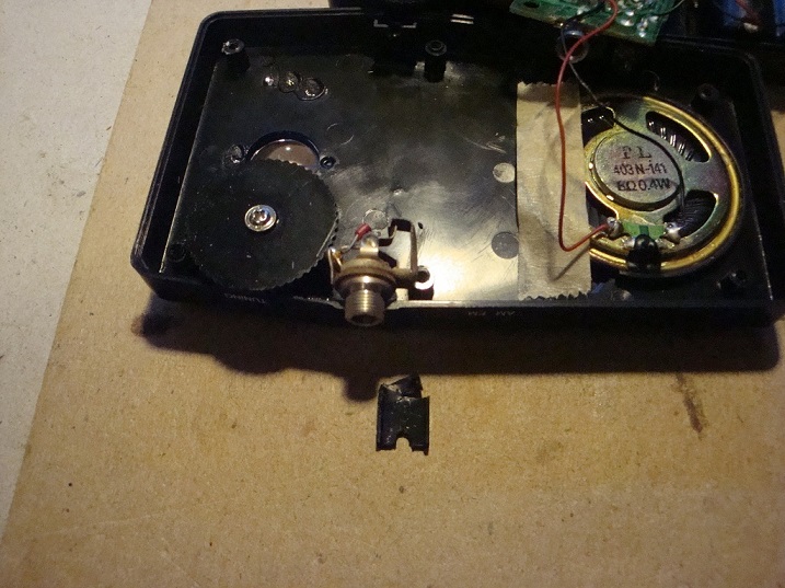 The second radio I did a little differently. The press-fit antenna connection was broken off and the wire for the earphone socket was attached to the underside connection solder pad. That pad was use for the connection to the press-fit antenna connector. This can be seen in photo 10: